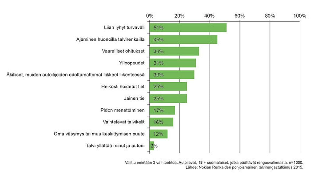 Tutkimuksen mukaan ihmiset pitävät talviautoilun suurimpina riskitekijöinä liian lyhyttä turvaväliä ja huonoja renkaita. Myös ohittelu ja ylinopeudet herättävät huolta.