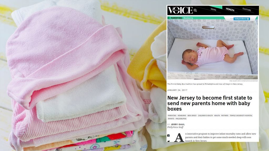 Äitiyspakkaukset saapuvat New Jerseyhyn, kertoo Popsugar-sivusto. Sivuston mukaan vanhemmille annetaan ”ilmainen pahvilaatikko, jossa vastasyntynyt voi nukkua”.