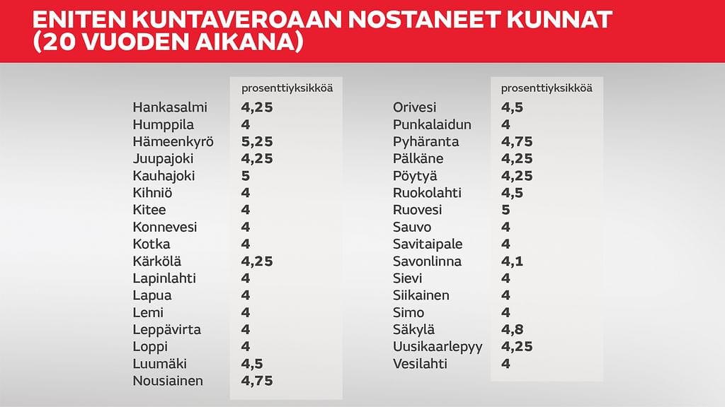 MTV Uutiset selvitti kuntaverotilastoista eniten kunnallisveroaan nostaneet kunnat viimeisen 20 vuoden aikana. Mukaan pääsivät kaikki vähintään neljä prosenttiyksikköä nostaneet valtuustot.