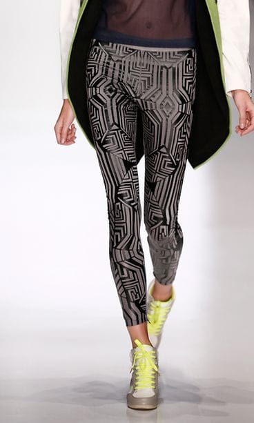 Legginsien suosio on jatkunut jo monta vuotta. Tänä vuonna on nähty erityisesti kaksivärisiä legginsejä, joiden kuviointi on etnotyyppinen. Kuvan esimerkin legginsit ovat Art Square -näytöksestä Venäjän muotiviikoilta syksyltä 2013.