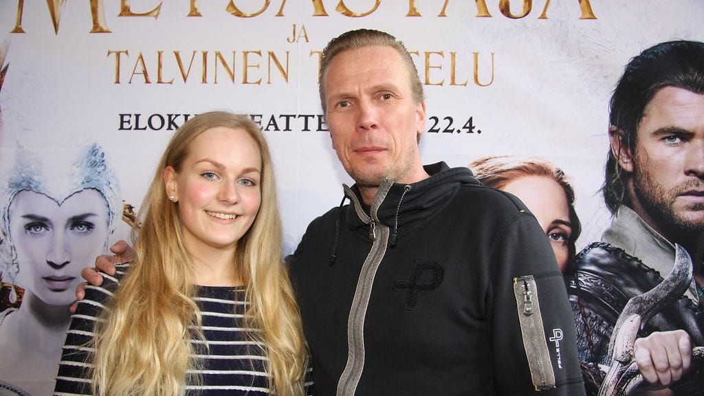 Näyttelijä Jukka Rasila saapui Metsästäjä ja talvinen taistelu -elokuvan kutsuvierasnäytökseen Helsingin Tennispalatsiin 15-vuotiaan tyttärensä Lillin kanssa.
