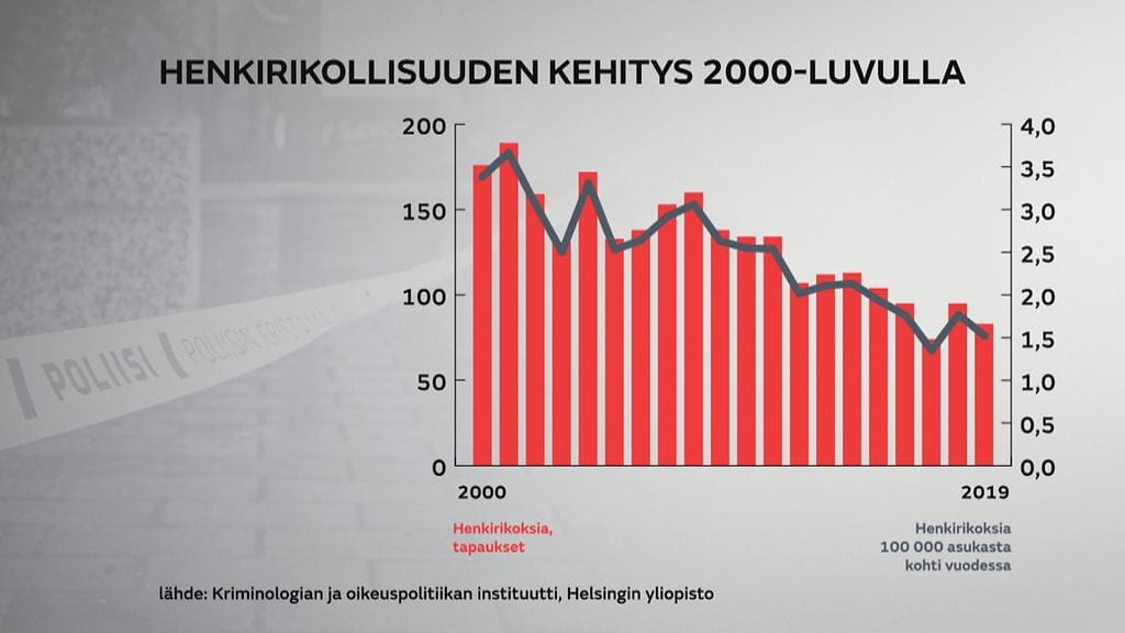 Henkirikosten määrä on pudonnut Suomessa merkittävästi 2000-luvulla. Kun vielä vuosituhannen alussa tehtiin Suomessa pahimmillaan 189 murhaa tai tappoa vuodessa, viime vuonna luku oli enää 83.
