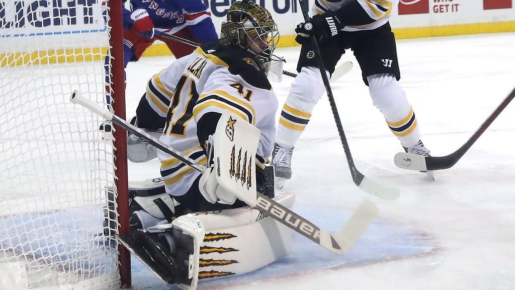 Suomalaismaalivahti Tuukka Rask seurasi sivusta, kun hänen aisaparinsa Jaroslav Halak torjui Boston Bruinsille 1-0-vierasvoiton New York Rangersista jääkiekon NHL:ssä Suomen aikaa lauantaina vastaisena yönä.