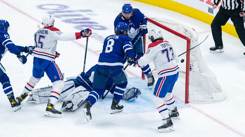 Jääkiekon NHL:ssä perinteisten kanadalaisseurojen Toronto Maple Leafsin ja Montreal Canadiensin 1. pudotuspelikierroksen ottelusarja tasoittui, kun Toronto voitti joukkueiden välisen kamppailun maalein 5–1. Ottelusarjassa tilanne on nyt 1–1.