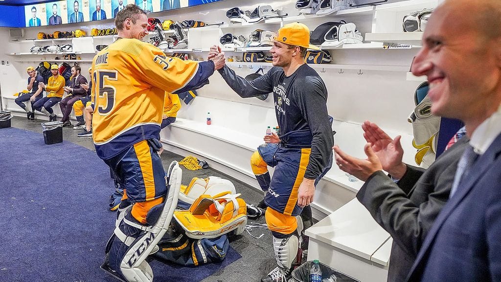 Suomalaisvahti valittiin ottelun ykköstähdeksi, mutta Predatorsin pukukopissa ykköstähdeksi nousi Salomäki, jota Rinne onnitteli 1-0-voittomaalista.