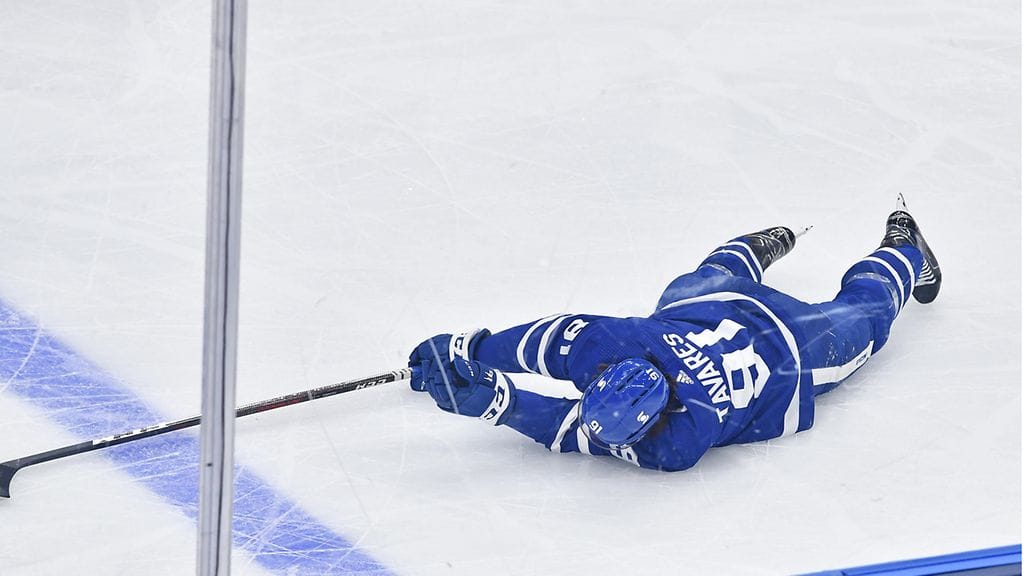 NHL:n pudotuspelikierroksella nähtiin pelottava tilanne, kun Toronto Maple Leafsin supertähti John Tavares loukkaantui ikävässä törmäyksessä.