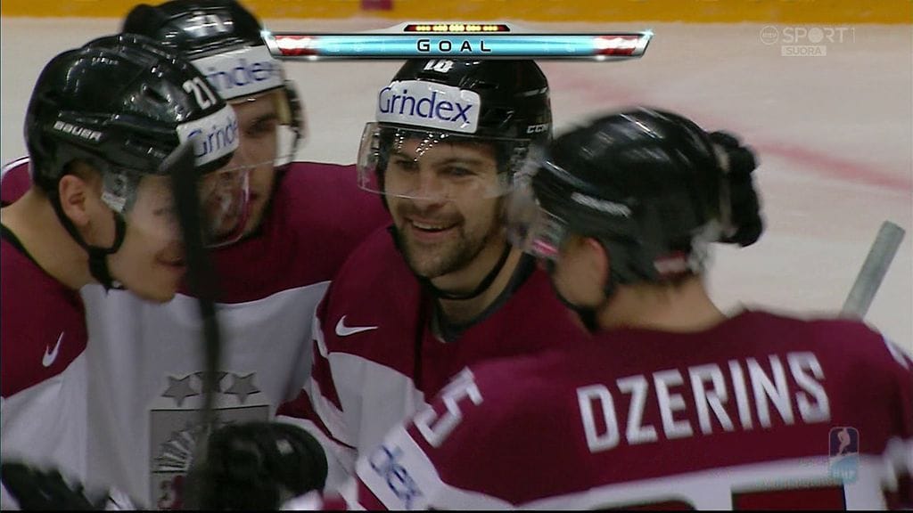 Kaspars Daugavins johdatteli Latvian 2-1-johtoon Tanskaa vastaan jääkiekon MM-kisoissa Moskovassa.