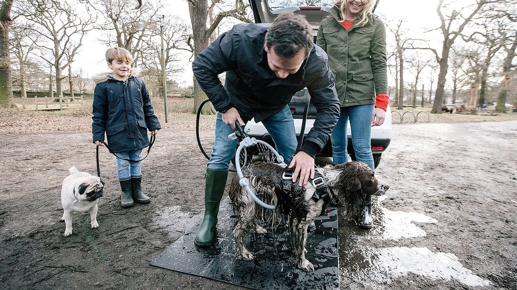 Nissan X-Trail 4Dogs sisältää autosta ulosvedettävän 360 asteen suihkun koiran puhdistamiseen sekä pesualustan. Pesun jälkeen laitteen voi vaihtaa myös kuivaajaan. Suihku on ehdottomasti hyvä idea kurakeleillä, mutta 360 asteen vesikaaren lisäksi voisi tarjolla olla myös terävämpi suihku. Useimmiten ongelma kun keskittyy tassujen puhdistamiseen. Koko koiran ollessa likainen, koiran ympärillä oleva vesikaari toki nopeuttaa projektia. Tavaratilassa on myös integroitu kuivausjärjestelmä, joka puhaltaa lämmintä ilmaa.