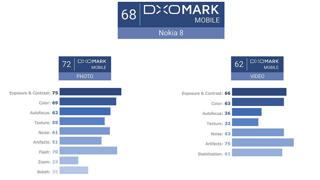 Valokuvien osalta Nokia 8 ylsi 72 pisteeseen, mutta videokuvaamisessa pistemäärä jäi 62:een.