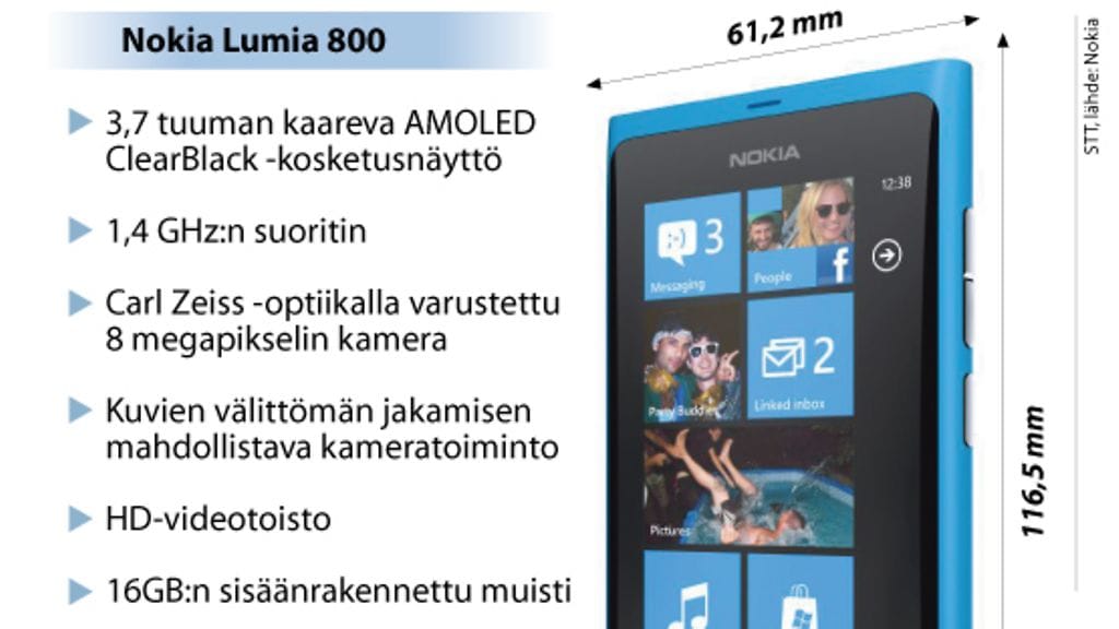 Ohessa uutistoimisto STT:n arvio Nokian Lumia 800 -Windowspuhelimesta.