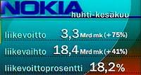 Toisella vuosineljänneksellä Nokia teki tulosta ennen veroja ja vähemmistöosuutta runsaat 3,2 miljardia markkaa. Nousua edellisvuoden vastaavasta ajasta oli 73 prosenttia. Nokian liikevaihto puolestaan lisääntyi 41 prosenttia ja oli huhti-kesäkuussa 18,4 miljardia markkaa. Erityisen voimakkaasti kasvoi Nokian matkapuhelinmyynti, joka lisääntyi toisella neljänneksellä edellisvuodesta 50 prosenttia lähes 11 miljardiin markkaan.