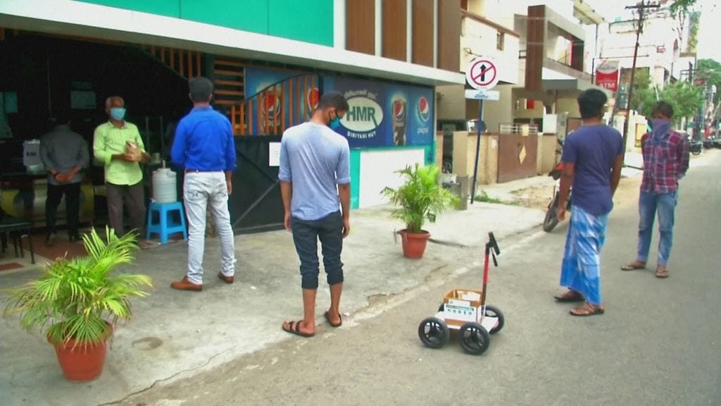 Intialainen insinööri on kokeillut uudenlaista tapaa hoitaa kaupassakäynnit korona-aikana. Piskuinen robottikärry noutaa ostokset kaupasta – ja jonottaa kiltisti omaa vuoroaan.