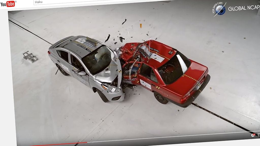 Autojen kolarikestävyyttä ja -turvallisuutta tutkivan NCAPin videolla Nissan Versa ja Nissan Tsuru ajavat osittaisen nokkakolarin. Kumpikin auto liikkui noin 65 kilometrin tuntinopeudella.