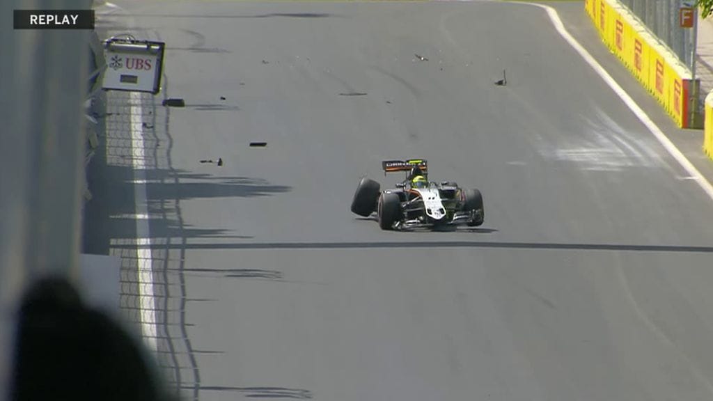 Perez osui seinään samassa mutkassa, jossa Daniel Ricciardo hajotti Red Bullinsa perjantaina.