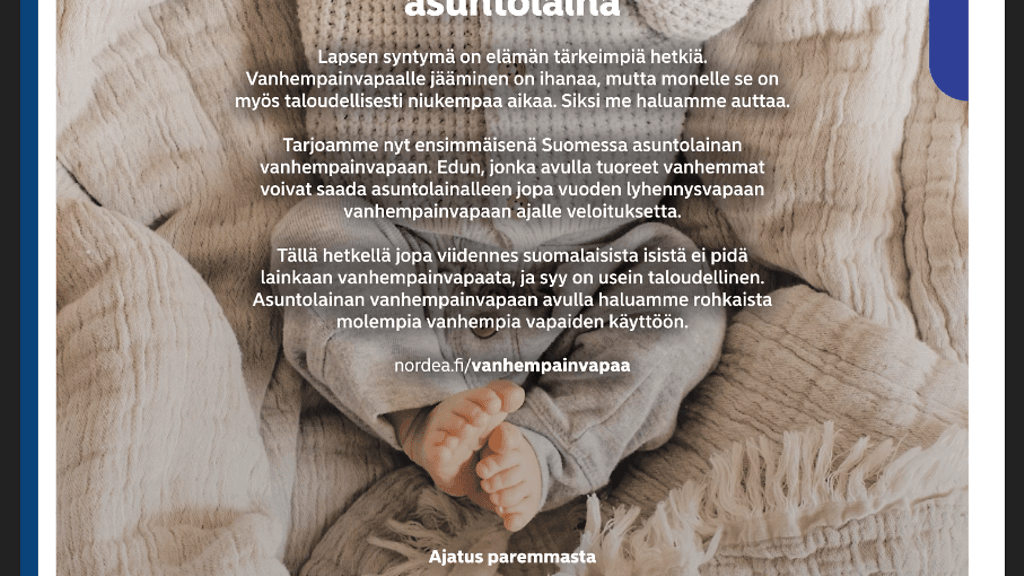 Helsingin Sanomissa julkaistussa Nordean mainoksessa oli tänään lauantaina kuusivarpainen vauva. Nordea selittää mainosta viestipalvelu X:ssä.