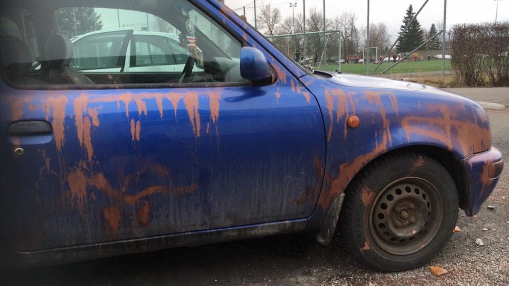 Kouvolalainen nuorimies kohtasi eilisaamuna pihassaan karun näyn: auto oli maalitöhryjen peitossa.