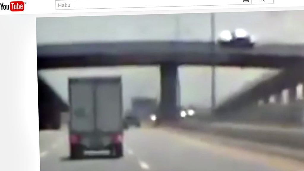 Auto nousee sillan turvavallin yli, liukuu sen reunaa pitkin hetken ja tippuu sen jälkeen reunan yli alla kulkevalle, ruuhkaiselle moottoritielle. Oli onni onnettomuudessa, että auto ei tippunut suoraan toisen ajoneuvon päälle.