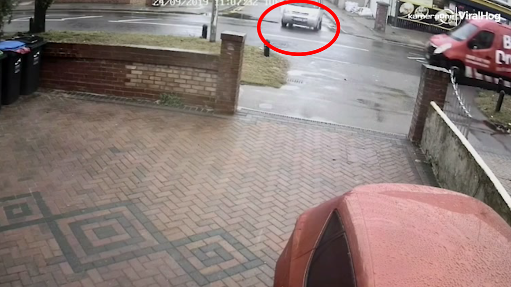 Omakotitalon valvontakameralle tallentui vaarallinen hetki, kun talon edustalla rauhallisella tiellä kaksi autoa kolaroivat. Tilanne sattui Kentin kreivikunnassa Britanniassa.