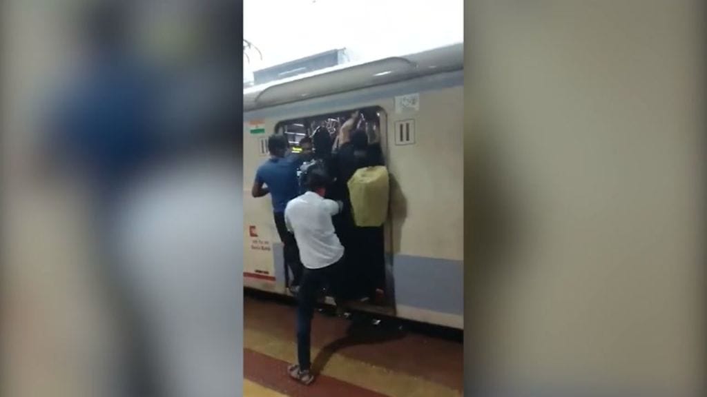 Silminnäkijän kuvasi Borivalin rautatieasemalla torstaina videon, jossa näkyy, kuinka jo valmiiksi täyteen ahdattuun junaan pyrkii sisälle useita ihmisiä.