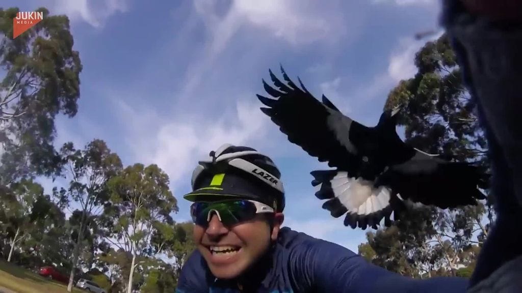 Yläpuolelta löytyvältä videolta on nähtävissä, kuinka ärhäkkä harakka yrittää hyökätä tilanteessa useita kertoja hänen polkiessaan kovaa vauhtia eteenpäin.