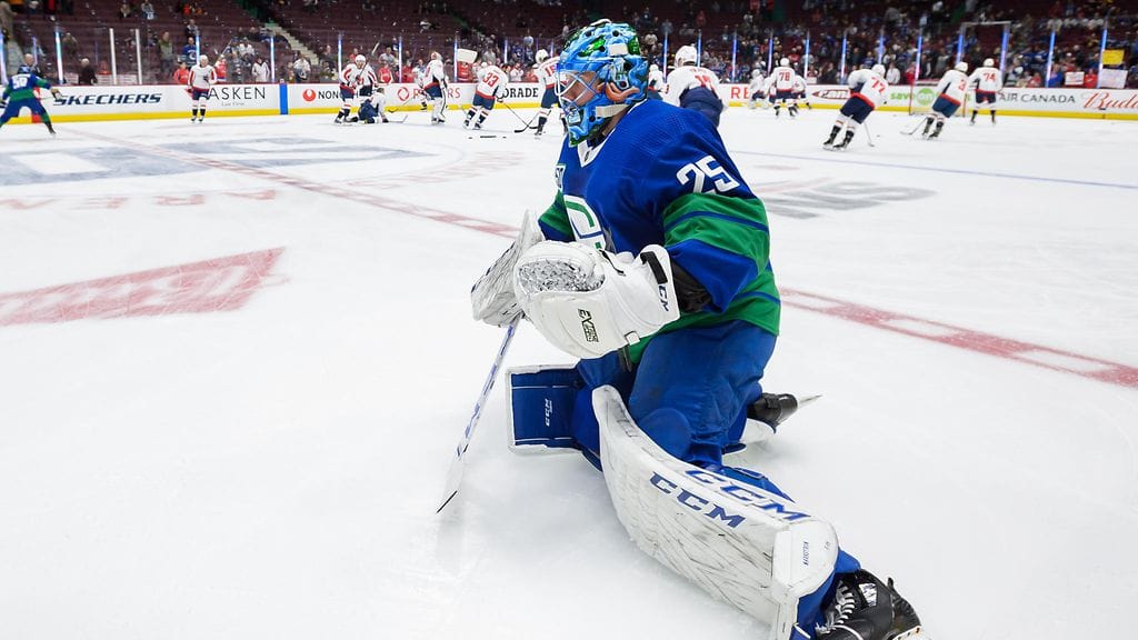 Loistavasti kauden aloittanut ruotsalaisveskari oli mukana ideoimassa upeaa maskia, jonka maalaus toimii tribuuttina Canucksin vuosina 1979–1997 käyttämälle logolle.