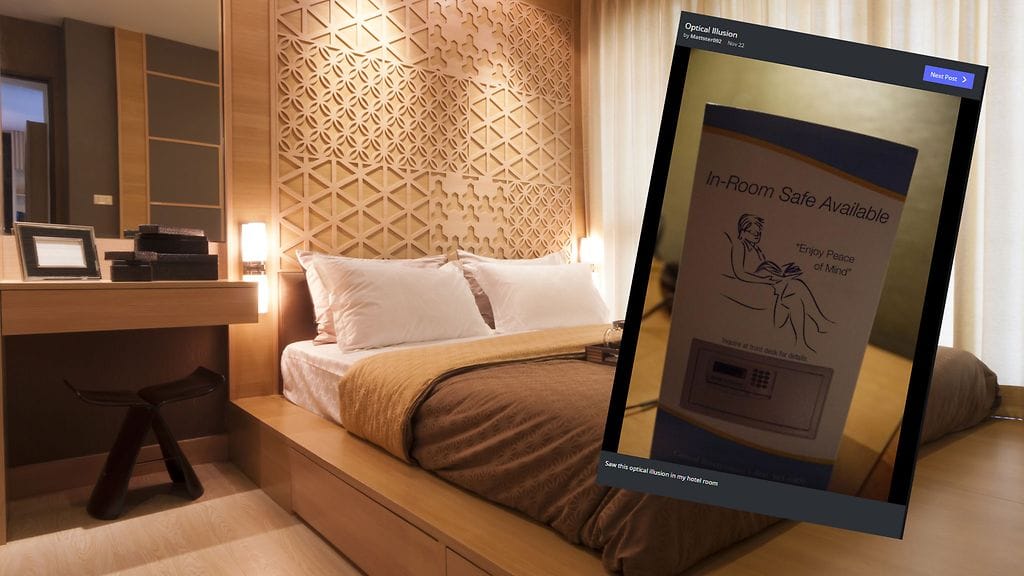 Kuvassa mainostetaan hotellihuoneen kassakaappipalvelua. "Nauti mielenrauhasta" kuvassa lukee. Mutta mitä sinun silmäsi näkevät kuvan naisen tekevän?