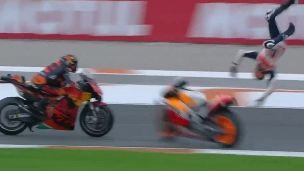 Hondan Alex Marquez koki kovia aika-ajojen ensimmäisessä osiossa, kun espanjalainen menetti pyöränsä hallinnan ja lensi voltilla asfaltin pintaan. Marquez näytti kuitenkin selviytyneen tärskystä ilman suurempia vahinkoja, mutta joutui jättämään aika-ajot kesken. Marquez lähtee sunnuntain kilpailuun toiseksi viimeisestä ruudusta.