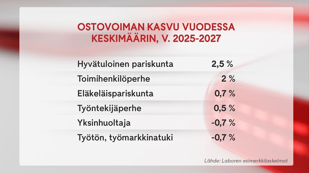 Esimerkiksi hyvätuloisen perheen ostovoima paranee vuodessa keskimäärin 2,5 prosenttia vuosina 2025–2027. Pienipalkkaisen yksinhuoltajan ja työmarkkinatukea saavan työttömän ostovoima heikkenee eniten, keskimäärin -0,7 prosenttia vuodessa.