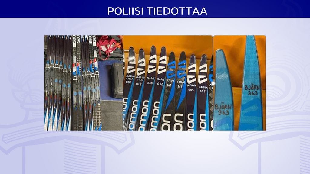 Anastetun tavaran joukossa oli myös lasten yhteiskäytössä olleita kilpasuksia. Suksipusseineen anastetut sukset ovat merkiltään Salomon, Fischer ja Peltonen. Suksien kärkiin on kirjattu mustalla tussilla sarjanumeroiden kolme viimeistä numeroa, kuten kuvassa näkyy.