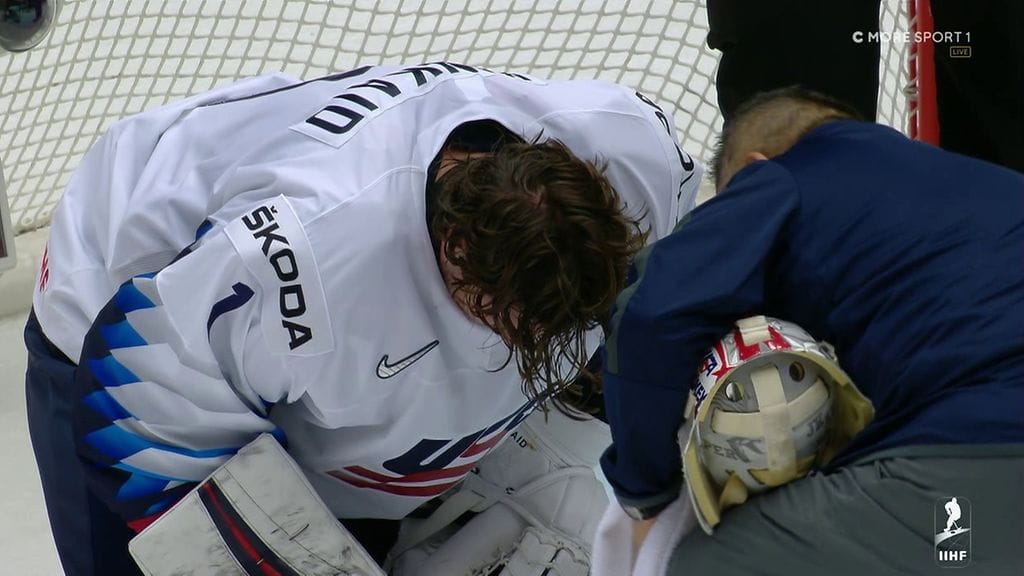 Jääkiekon MM-kisojen parhaisiin maalivahteihin lukeutunut Yhdysvaltain Keith Kinkaid sai ottelussa Leijonia vastaan kipeän osuman Mikko Rantasen laukauksesta.