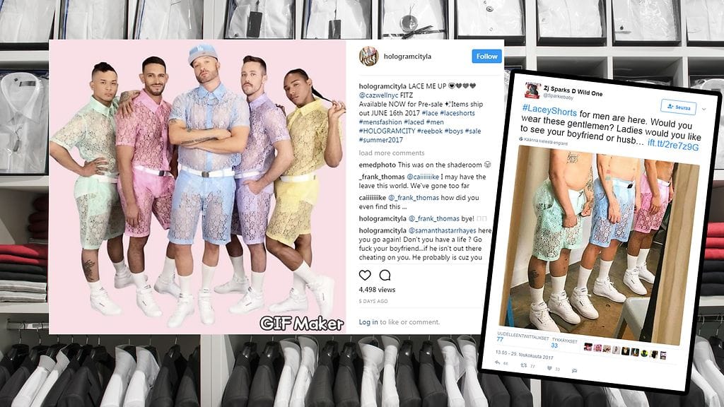 Käyttäisitkö läpinäkyvää pitsiasua? Los Angelesissa sijaitseva Hologram City uskoo, että läpikuultava pitsi sopii kaikille – myös miehille! Merkin lanseeraamaan pitsimallistoon kuuluu läpinäkyviä shortseja ja paitoja pastellin sävyissä.