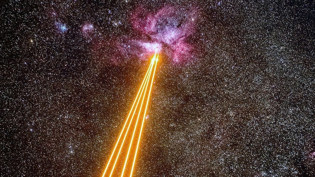 ESO:n julkaisemassa kuvassa ammutaan neljällä oranssilla lasersäteellä kohti 7500 valovuoden etäisyydellä sijaitsevaa Carina Nebula -tähtisumua. Kyse ei ole erikoistehosteista, vaan aivan aidosta tilanteesta. Avaruustaistelusta ei kuitenkaan ole kyse.