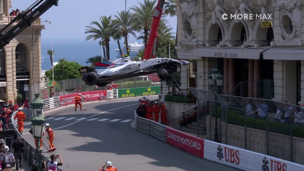 Stroll haki Monacon kasinon mutkassa ajolinjaa kaukaa oikeasta reunasta ja menetti autonsa hallinnan. Williams kolahti teräskaiteeseen, mikä rikkoi ainakin etusiiven sekä oikean etupyörän ripustukset.