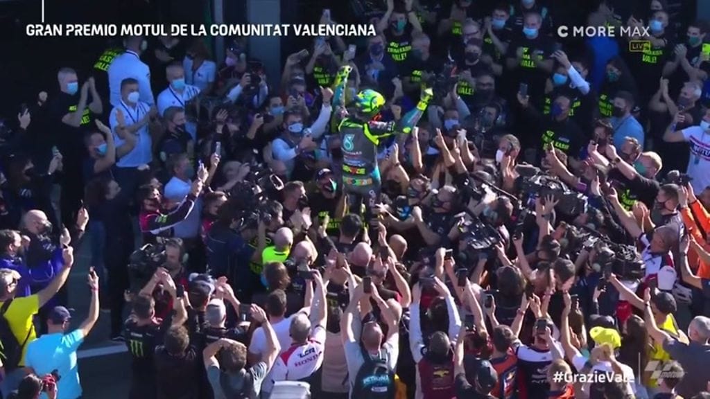 Urallaan yhdeksän maailmanmestaruutta, joista MotoGP:ssä seitsemän (2001-2005, 2008 ja 2009), voittanut Rossi ajoi kauden päättäneessä Valencian osakilpailussa kymmenenneksi. Kisan jälkeen 42-vuotias Rossi sai suuret suosionosoitukset sekä muilta kilpailijoilta että kisayleisöltä.