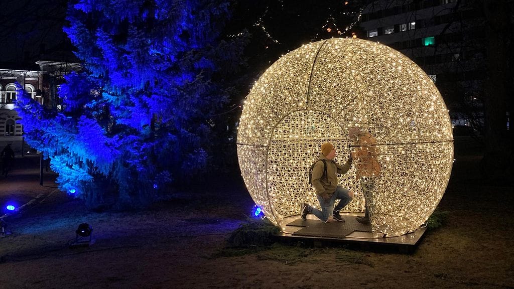 Kuvankaunis ja romanttinen kosintahetki on ihastuttanut tuhansia suomalaisia. Upeassa otoksessa mies polvistuu naisen eteen puistossa sijaitsevan valotaideteoksen sisällä.