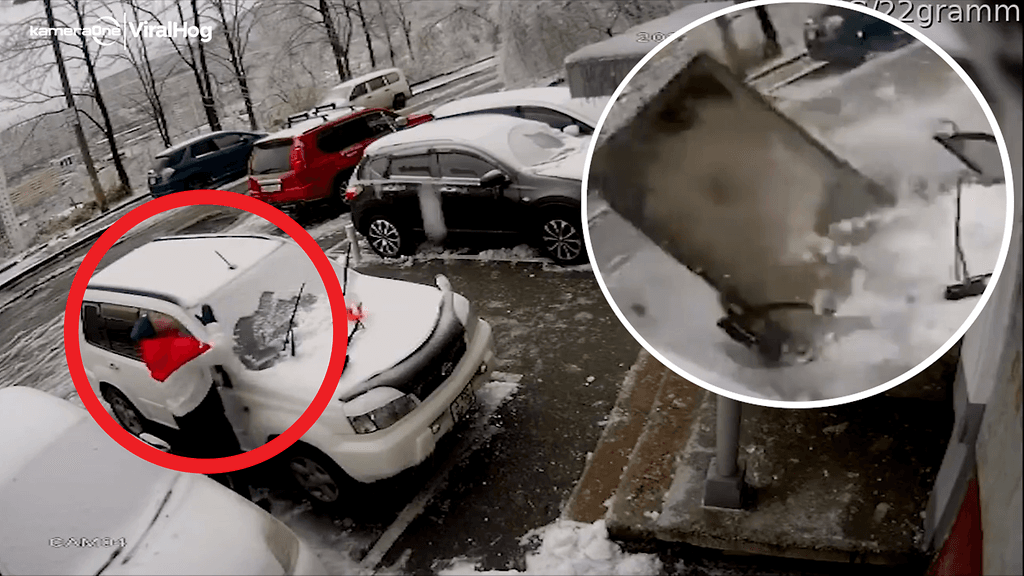 Valvontakamera tallensi hurjan tilanteen torstaina Vladivostokin kaupungissa Venäjällä, kun autoaan pihalla lumesta putsannut mies yllätettiin yläilmoista pahanpäiväisesti.