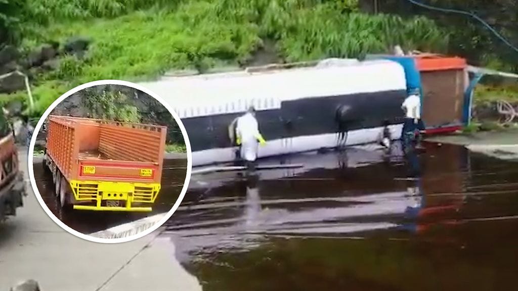 Öljysäiliörekka kaatui alamäkeen suuntaavalle tielle Intiassa.