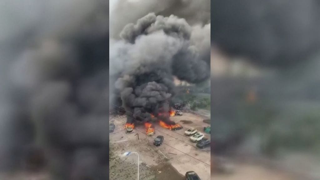 Kiinan valtiollisen median julkaisemassa videomateriaalissa näkyy, kuinka valtava tulipallo syöksähtää ilmaan ihmisten kirkuessa. Eräässä videopätkässä räjähdys heittää ilmaan suuren esineen, joka putoaa läheisen rakennuksen päälle.