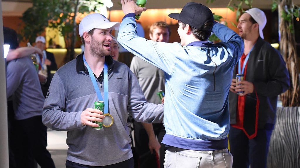 Kultaa Venäjällä järjestetyissä jääkiekon MM-kisoissa voittaneen Kanadan joukkueen pelaajat juhlivat voittoa olutta juoden.