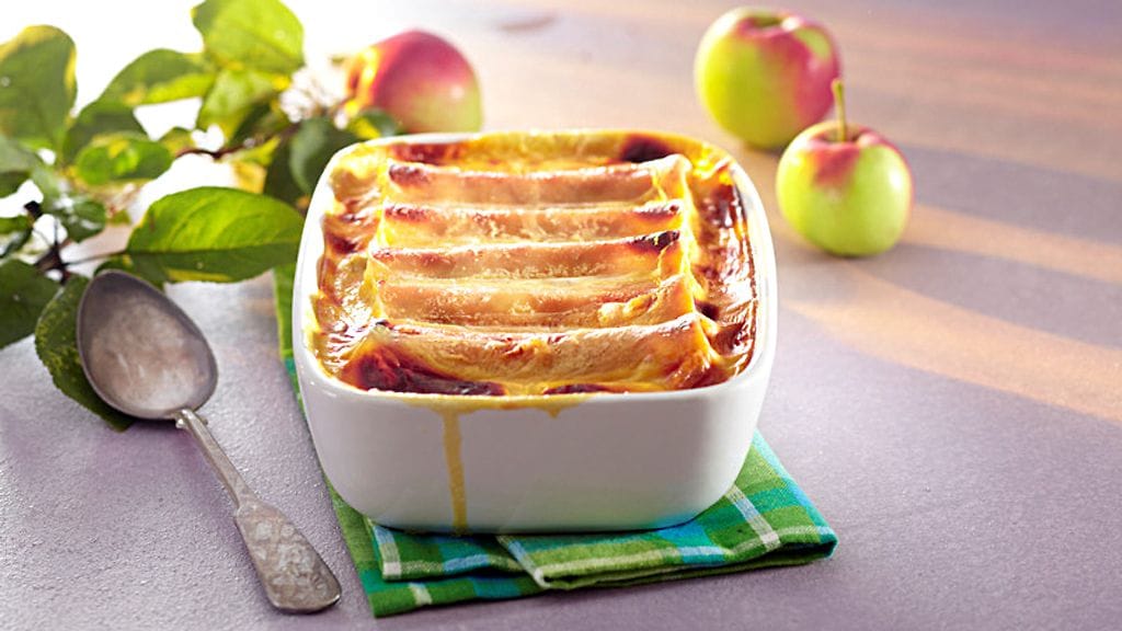 Pasta sopii myös jälkiruokiin! Vaihtelua saa käyttämällä omenan tilalla karpaloita, niitä ei tarvitse paistaa pannulla vaan ne lisätään lopuksi täyteseokseen.