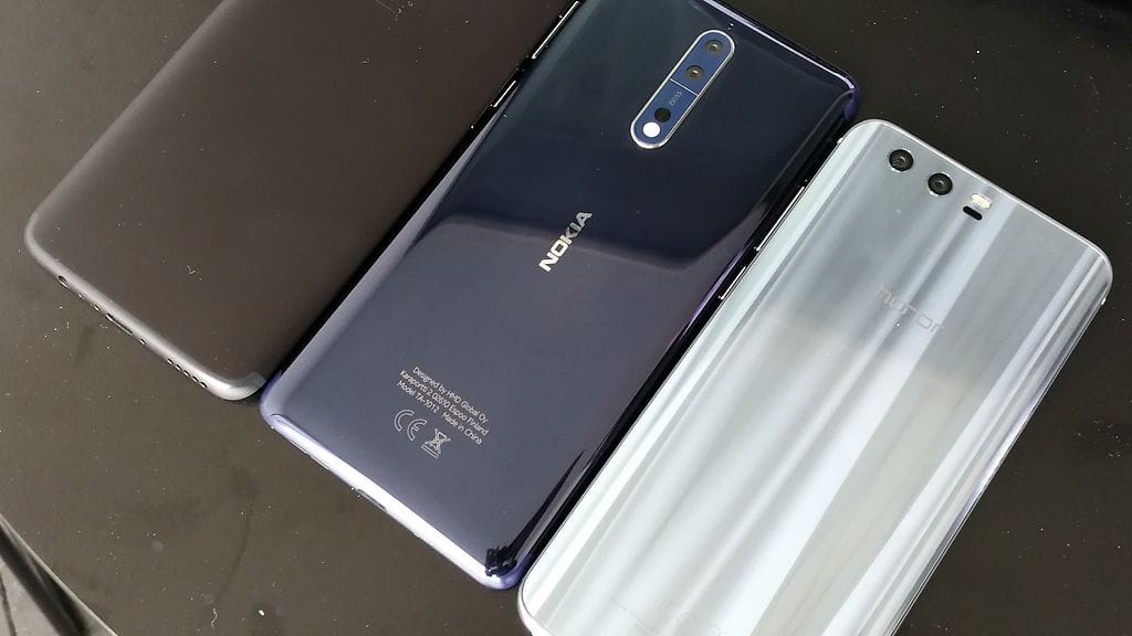 Puhelimet eroavat toki myös ulkoisesti. Nokia 8 ja OnePlus 5 ovat alumiinia, kun Honor 9:ssä takapinta on lasia. Nokia 8 on tulossa kuitenkin saataville myös kiillotettuina sinisenä ja kuparisena värivaihtoehtoina, jotka jo hieman muistuttavat lasipintaa.