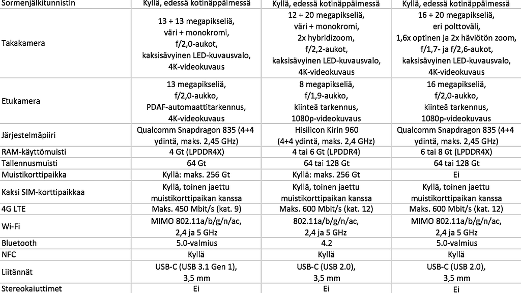 Alla vertailemme kolmikon teknisiä ominaisuuksia. Nokia 8:ssa on kahta muuta tarkempi näyttö, joka on yksi sen selkeimpiä valttikortteja. Kaikista kolmesta löytyy takaa kaksoiskamera, mutta toteutuksessa on pieniä eroja. OnePlus 5 tarjoaa hieman myös optista zoomia, Honor 9:ssäkin on 2x hybridizoom, kun taas Nokia 8:ssa kaksoiskameraa ei ole erityisesti hyödynnetty zoomaukseen. Sekä Nokia 8:ssa että Honor 9:ssä takakameroista toinen on monokromikamera, mikä mahdollistaa näyttävämmät mustavalkokuvat.