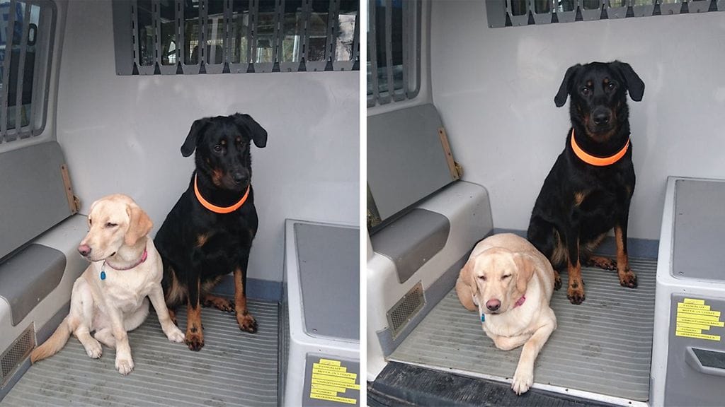 Helsingin poliisi liitti viestiin kuvan koirista poliisiauton kyydissä.