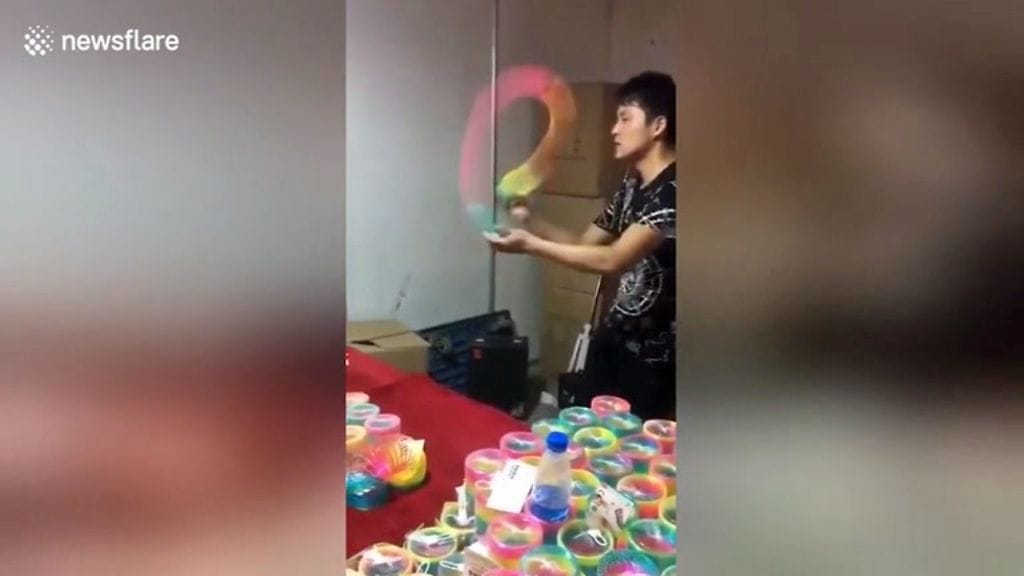 Omistitko 1990-luvulla klassisen vieterilelun, joka kulki englanniksi nimellä slinky? Monen leikkitaidot ulottuivat ainoastaan vieterin "kävelyttämiseen" portaita alas, mutta tällä videolla miehen taidot ovat aivan omaa luokkaansa! Katso videolta, miten kiinalainen lelumyyjä hauskuttaa lapsia ammattilaisen elkein.