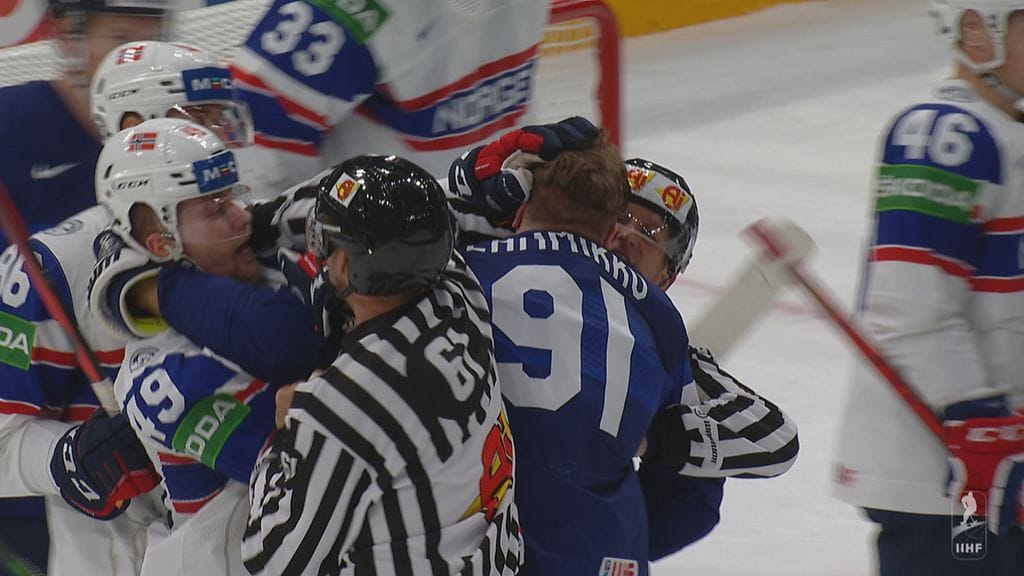 Leijonien ja Norjan välisen MM-avauksen toisessa erässä nähtiin erikoinen tuomariratkaisu, kun arkipäiväisen maalineduskahakan jälkeen sekä Juho Lammikko että Christian Kasastul saivat viiden minuutin rangaistukset tappelemisesta. Päätös hämmästytti ja kummastutti Lasse Kukkosta ja Karri Kiveä. Toisin kuin studiossa aluksi luultiin, kaksikko ei kuitenkaan saanut ulosajoa. Katso tilanne yllä olevalta videolta.