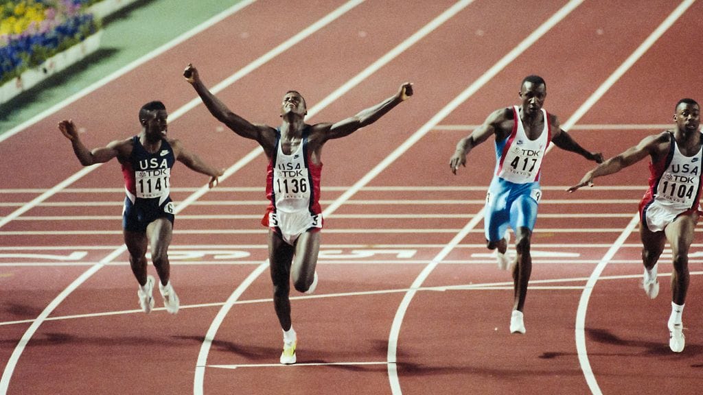 Lewis juoksi Tokion MM-kilpailuissa sadan metrin kuninkaaksi ajalla 9,86. Voittotulos leikkasi Leroy Burrellin kaksi kuukautta aikaisemmin juoksemasta maailmanennätyksestä hulppeat neljä sadasosaa. Burrell sijoittui Lewisin ennätysillassa toiseksi ajalla 9,88.