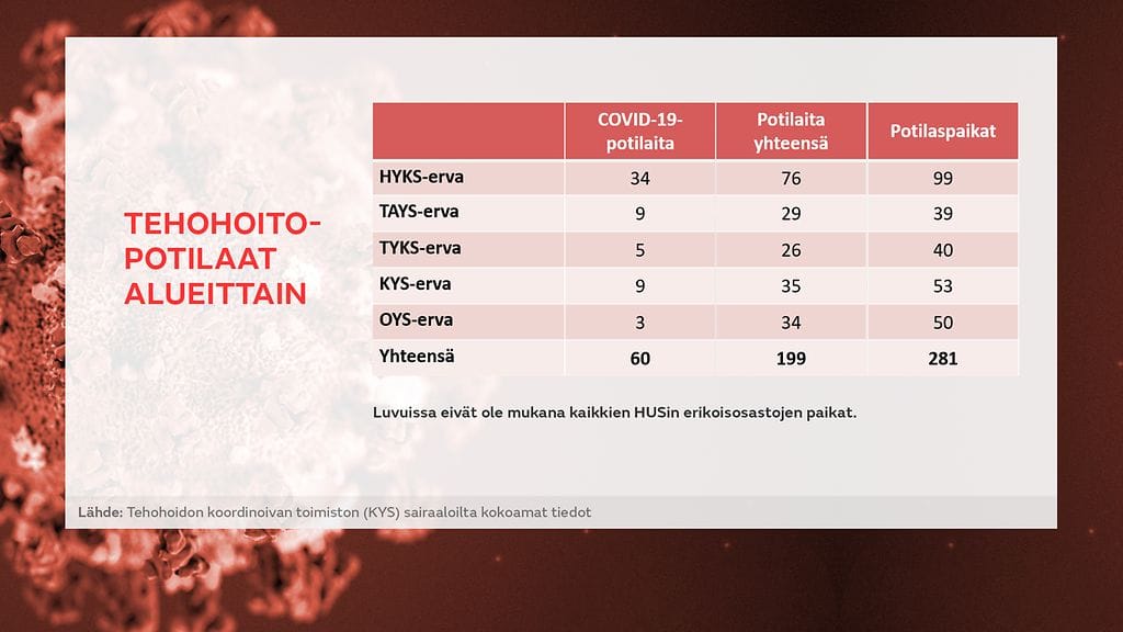 Vain kahdeksan heti vapaan tehohoitopaikan määrä kuulostaa hyvin matalalta, kun ottaa huomioon, että koko Suomessa koronapotilaita on teho-osastoilla tällä hetkellä yhteensä 60.