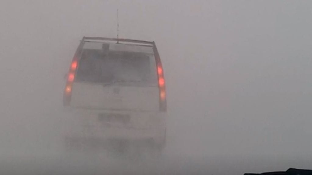 Näkyvyys on kovan lumimyrskyn vuoksi niin heikko, että edellä menevän auton hätävilkutkin on kytketty päälle.