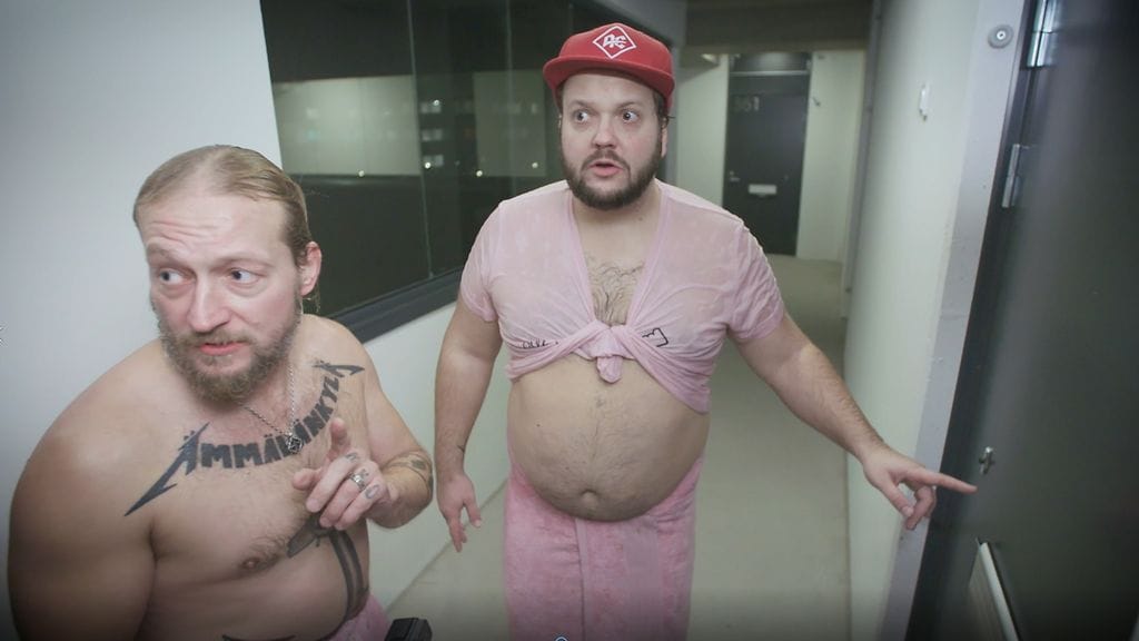 Hauskoilta tilanteilta ei vältytty, kun nelikko yritti sisään vieraisiin koteihin. Katso suihkuralli ylhäältä olevalta videolta!