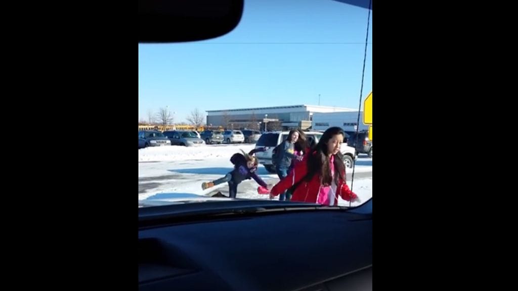 Tällä isällä oli hervottoman hauskaa, kun hän odotti lapsiaan koulusta. Amerikkalaisisä nimittäin huomasi autossa istuessaan, että useat lapset liukastuivat jalkakäytävällä samassa paikassa.